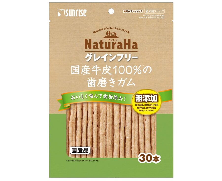 マルカン サンライズの「ナチュラハグレインフリー」シリーズから展開されている、国産牛皮を100%使用した歯磨きガムです。
